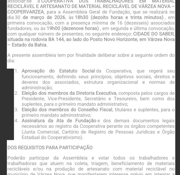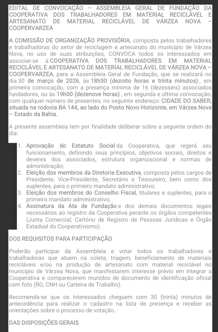 A Comissão de Organização Provisória, composta por trabalhadores e trabalhadoras do setor de reciclagem e artesanato de Várzea Nova, convoca todos os interessados a se associarem à Cooperativa dos Trabalhadores em Material Reciclável e Artesanato de Material Reciclável de Várzea Nova – Coopervárzea.