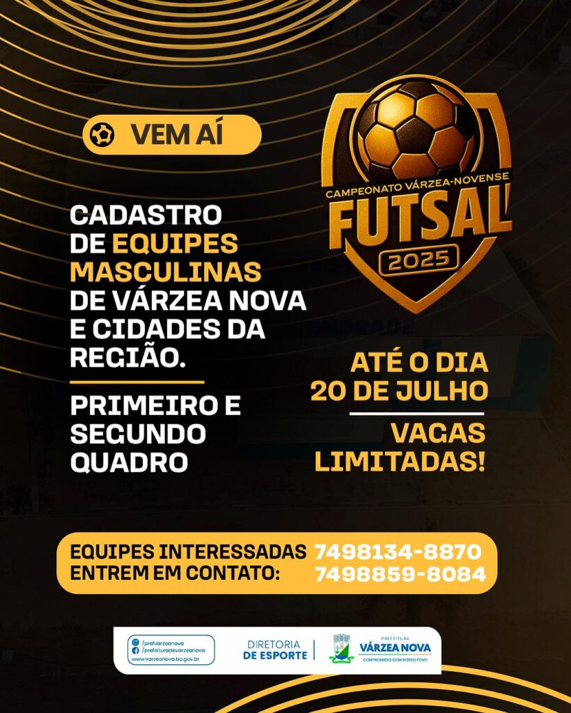 É a sua chance de brilhar nas quadras, representar sua cidade e disputar o título de campeão do futsal várzea-novense! Organize sua equipe, treine duro e venha fazer parte deste evento esportivo imperdível!