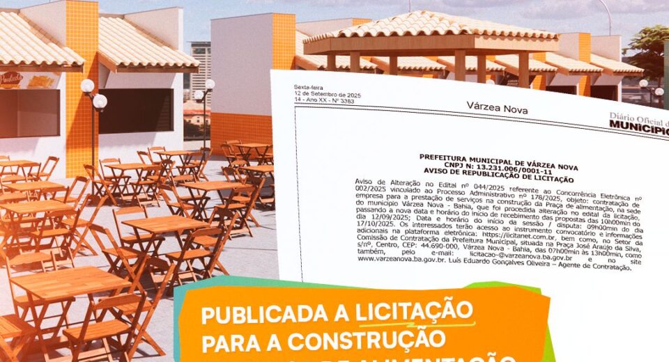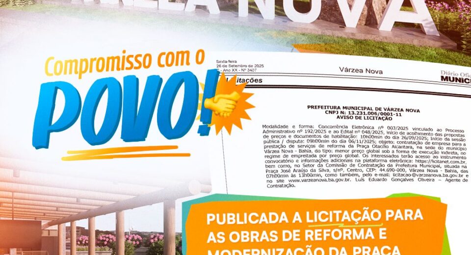 A Prefeitura de Várzea Nova anunciou nesta sexta-feira, 26 de setembro, a publicação da licitação para a reforma e modernização da Praça Otacílio Alcântara, a tradicional “Praça de Cima”. A obra será contratada por meio de Concorrência Eletrônica e marca mais um passo importante da atual gestão, que em apenas nove meses já licita sua […]