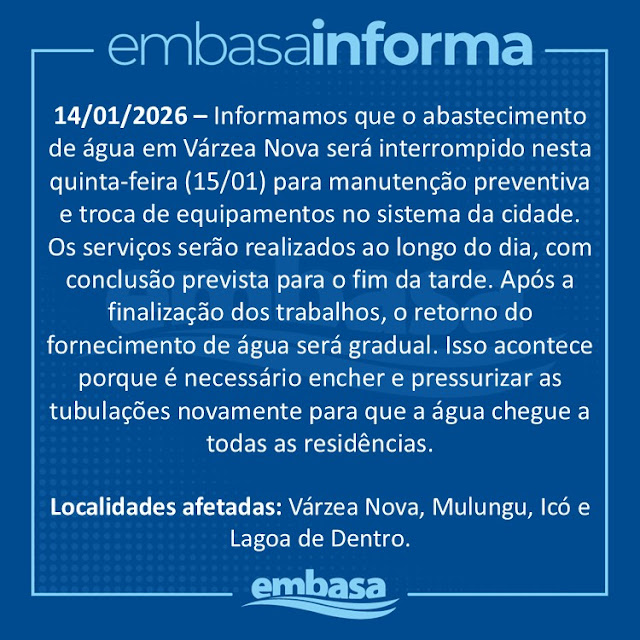 Notícias Embasa informa interrupção no sistema de abastecimento de Várzea Nova... A Embasa informa que o abastecimento de água de Várzea Nova será interrompido nesta quinta-feira, 15/01, para manutenção preventiva e... BY alison noticias janeiro 14, 2026 0 Comment