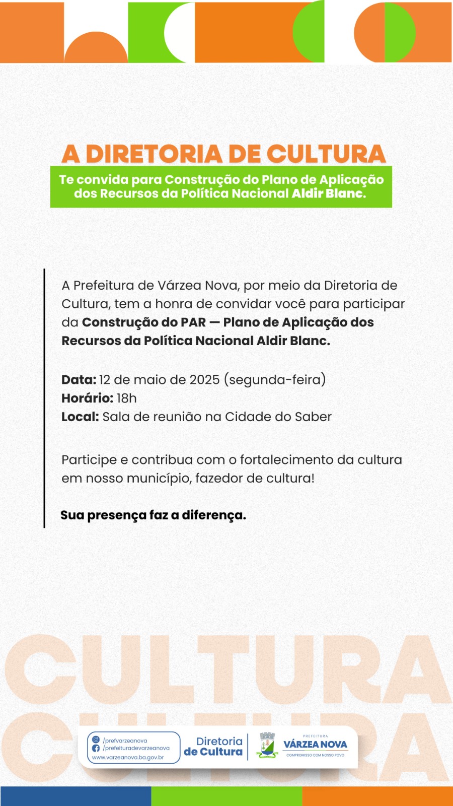 Notícias Prefeitura de Várzea Nova Convoca Participação Popular na Construção do... A Prefeitura de Várzea Nova, por meio da Diretoria de Cultura, convida a população para participar da construção coletiva do... BY alison noticias maio 9, 2025 0 Comment