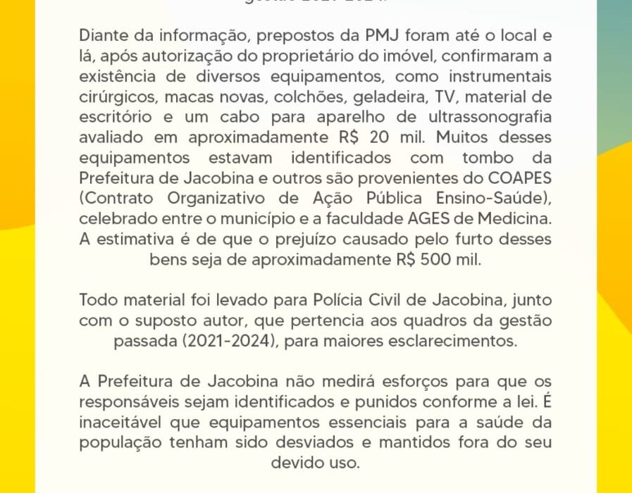 A Prefeitura de Jacobina não medirá esforços para que os responsáveis sejam identificados e punidos conforme a lei. É inaceitável que equipamentos essenciais para a saúde da população tenham sido desviados e mantidos fora do seu devido uso.A atual gestão reafirma seu compromisso com a transparência e a moralidade na administração pública, garantindo que situações como essa não sejam toleradas e que o patrimônio público seja protegido e utilizado exclusivamente para o bem da população.