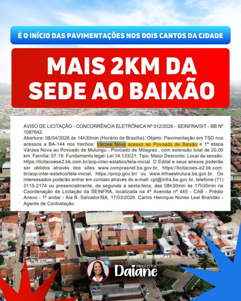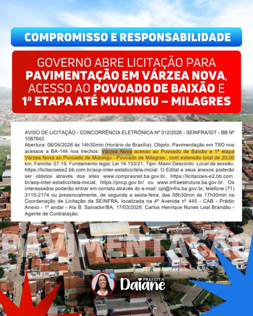 A concorrência eletrônica está marcada para o dia 8 de abril, às 14h30, e abrangerá a ligação da sede de Várzea Nova ao povoado de Mulungu, estendendo-se até o povoado de Milagres, totalizando cerca de 20 quilômetros.