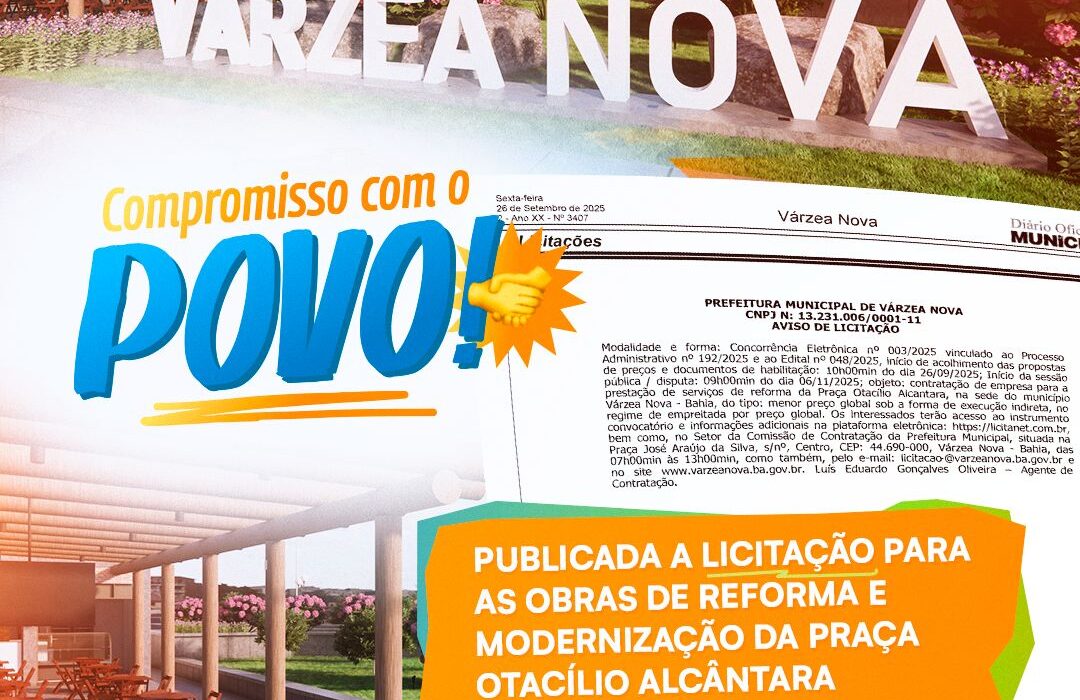 A Prefeitura de Várzea Nova anunciou nesta sexta-feira, 26 de setembro, a publicação da licitação para a reforma e modernização da Praça Otacílio Alcântara, a tradicional “Praça de Cima”.