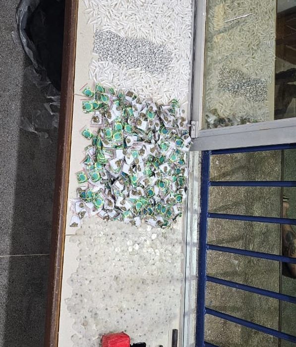MATERIAIS APREENDIDOS:▪️500 pedras de crack▪️348 pedras de Raxixi▪️1675 pinos de cocaína▪️520 porções de maconha▪️01 tablete maconha (740g)▪️01 celular Motorola azul ▪️01 balança de precisão ▪️01 simulacro de pistola ▪️01 garruncha calibre .22 artesanal