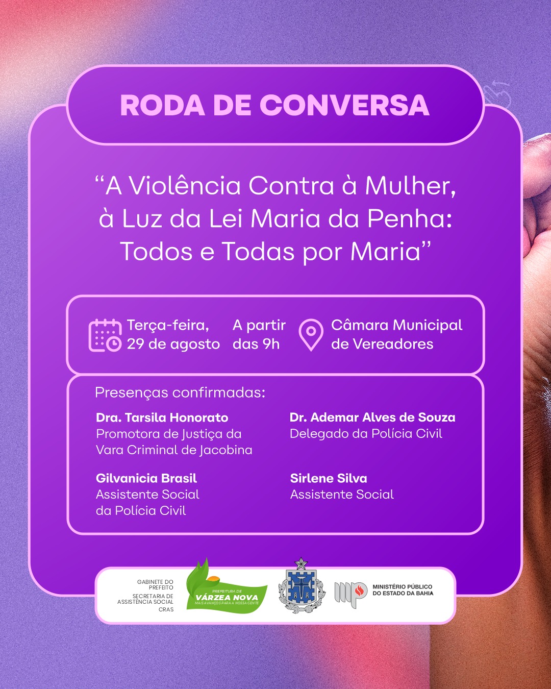 Na próxima terça-feira, 29 de agosto, vai acontecer em Várzea Nova uma Roda de Conversa da campanha Agosto Lilás, que busca a conscientização pelo fim da violência contra à mulher. O evento será realizado a partir das 9 horas, na Câmara Municipal de Vereadores da cidade.