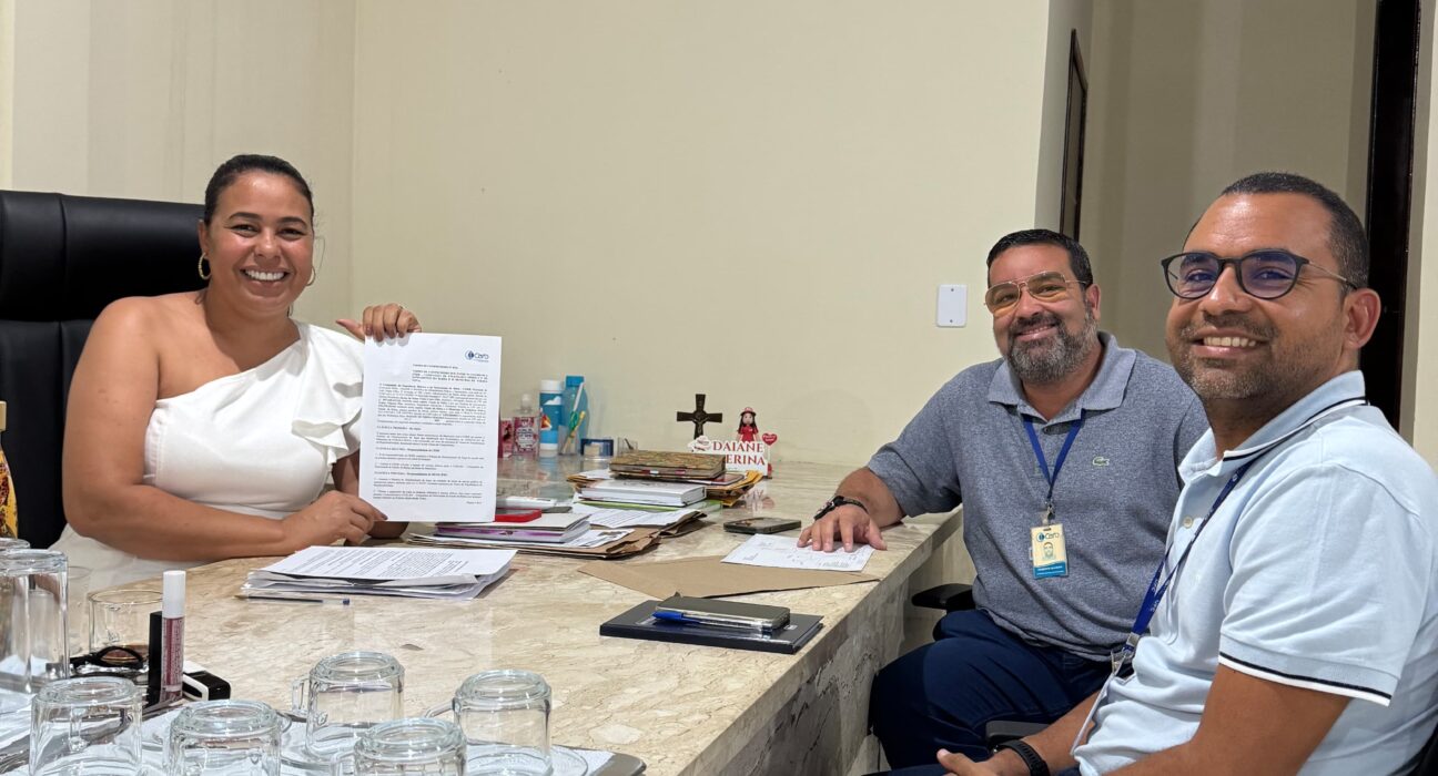Em um passo significativo para a melhoria da infraestrutura hídrica da comunidade de Conceição, a prefeita municipal de Várzea Nova recebeu em seu gabinete o gerente Regional da Companhia de Engenharia Hídrica e de Saneamento da Bahia (CERB), engenheiro Roberto Oliveira. Durante a reunião, foi assinado um termo de compromisso que permitirá a instalação do sistema de abastecimento de água na localidade.Esse avanço é especialmente importante, pois o poço artesiano, que foi perfurado graças a uma emenda parlamentar do Deputado Federal Daniel Almeida, não estava funcionando adequadamente. Com a assinatura do termo, a gestão municipal se mostra otimista e espera que, em breve, os moradores possam usufruir da água potável desse poço.A prefeita destacou a importância desse projeto para a comunidade, ressaltando que o acesso à água é um direito fundamental e essencial para a qualidade de vida. Com essa parceria com a CERB, espera-se não apenas resolver os problemas atuais relacionados ao abastecimento, mas também garantir um futuro mais sustentável e saudável para todos os cidadãos de Conceição.