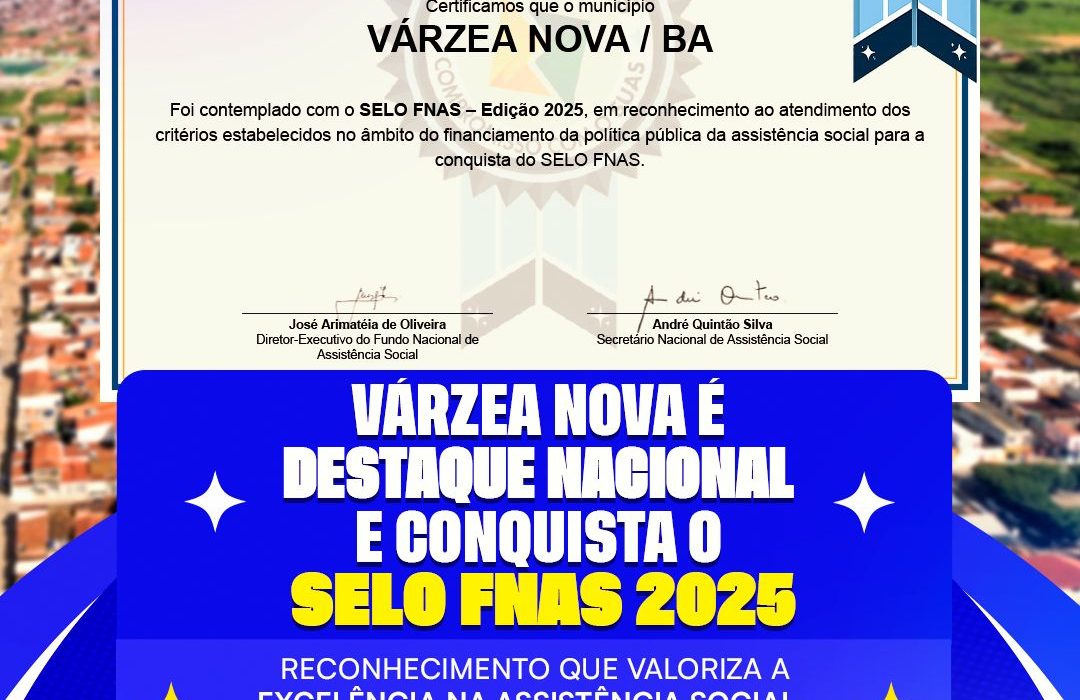 A Prefeitura de Várzea Nova alcançou, pela primeira vez, o Selo FNAS – Edição 2025, reconhecimento nacional concedido a municípios que se destacam na gestão dos recursos e na execução das políticas públicas de assistência social.