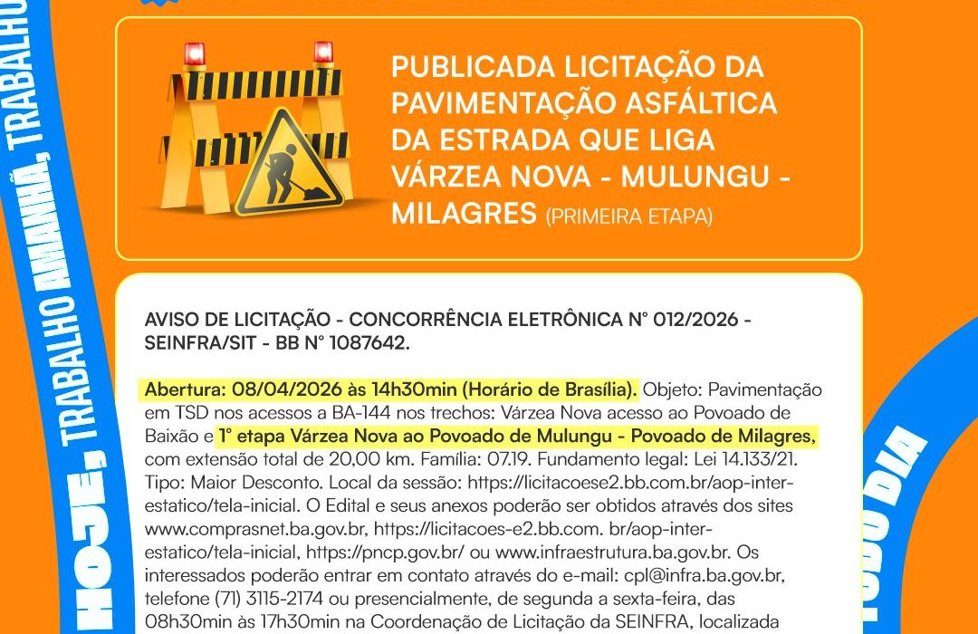 O Governo da Bahia publicou a licitação, na modalidade Concorrência Eletrônica, para a execução das obras de pavimentação asfáltica em TSD da estrada que liga o município de Várzea Nova ao povoado de Milagres, passando pela comunidade do Mulungu.