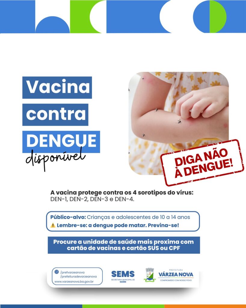 A Prefeitura de Várzea Nova, por meio da Secretaria Municipal de Saúde, deu um importante passo na proteção da saúde dos jovens do município. Neste mês de Julho, teve início a campanha de vacinação contra a dengue, focada em adolescentes de 10 a 14 anos. A iniciativa visa prevenir a doença e garantir um futuro mais saudável para a juventude várzea-novense.A vacina, que protege contra os quatro sorotipos do vírus da dengue (DEN-1, DEN-2, DEN-3 e DEN-4), está disponível nas unidades de saúde mais próximas de você. É fundamental que os pais e responsáveis levem seus filhos para se vacinarem, não se esquecendo de portar o cartão de vacinas e o cartão do SUS ou CPF.