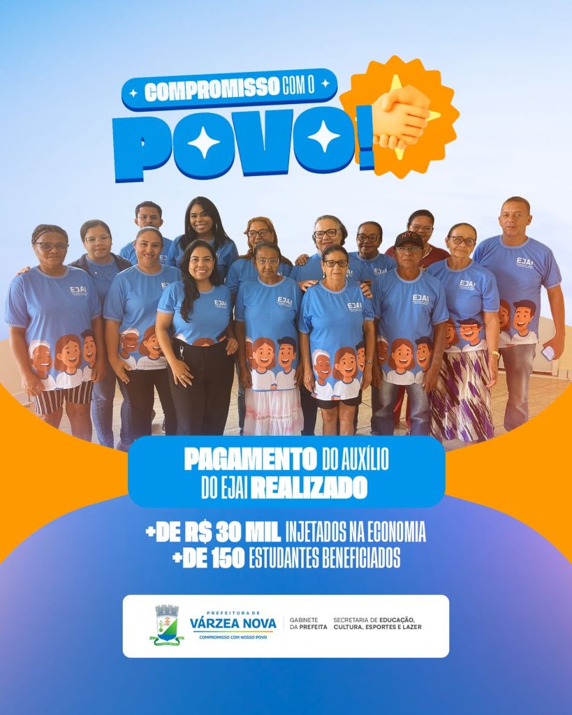 A Prefeitura de Várzea Nova realizou o pagamento do incentivo financeiro destinado aos alunos da Educação de Jovens, Adultos e Idosos (EJAI), beneficiando mais de 150 estudantes e injetando mais de R$ 30 mil diretamente na economia do município.