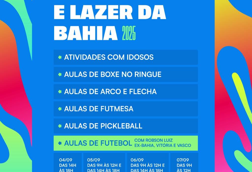 Durante o festival, os participantes poderão aproveitar aulas de boxe no ringue, arco e flecha, futmesa, pickleball e futebol com Robson Luiz, ex-jogador do Bahia, Vitória e Vasco.